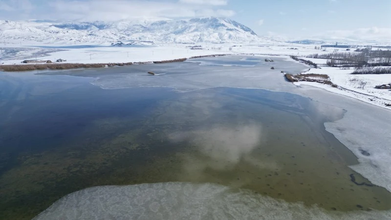 Soğuk havaların etkisiyle yüzeyinin bir kısmı buzla kaplanan Ulaş Gölü havadan dron ile görüntülendi.
