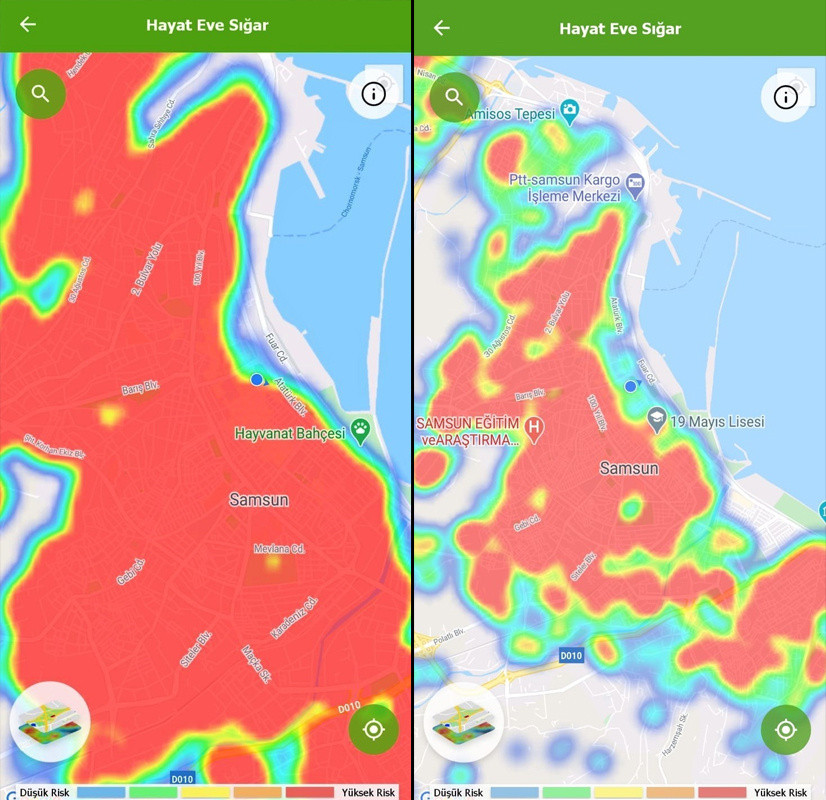 Samsun’da ‘Hayat Eve Sığar Uygulaması’ndan (HES) 3 Aralık ve 24 Aralık tarihlerinde 3 hafta zaman aralığıyla alınan görüntüler korona virüsünde vaka sayısındaki düşüşü gözler önüne serdi. HES uygulamasındaki yoğunluk haritasında 3 hafta önce kırmızının hâkim olduğu, bazı yerlerde ufak yeşil noktaların olduğu gözlemlenebiliyordu. Bugün korona virüsü yoğunluk haritasında risk yoğunluğunun azalmasıyla az olan yeşil alanların çoğalmaya başladığı görülüyor.