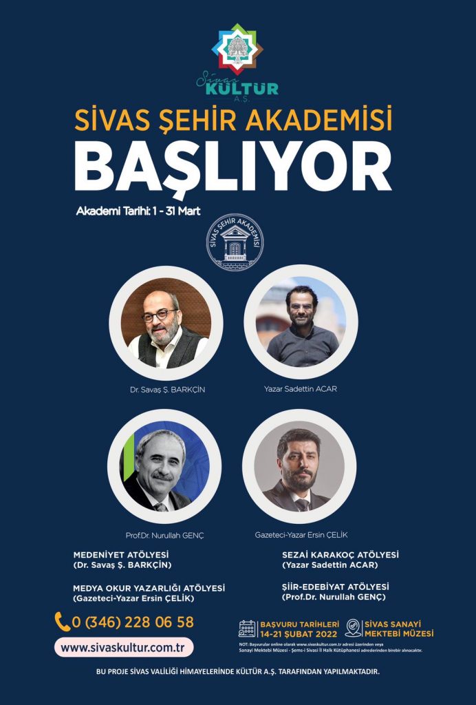 Dr. Savaş Şafak Barkçin’in Medeniyet Atölyesi, Prof. Dr. Nurullah Genç’in Şiir-Edebiyat Atölyesi, Yazar Saadettin Acar’ın Sezai Karakoç Atölyesi ve Gazeteci-Yazar Ersin Çelik’in Medya Okuryazarlığı (İletişim ve Yeni Medya) Atölyesi’nde eğitim vereceği akademi çalışmaları Sivas Sanayi Mektebi Müzesi’nde gerçekleştirilecek. Ücretsiz olan eğitimlerin ilki 1-31 Mart tarihlerinde yapılacak.