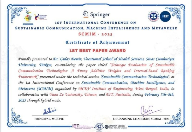 Sivas Cumhuriyet Üniversitesi Sağlık Hizmetleri Meslek Yüksekokulu’nda görev yapan Doç. Dr. Gülay Demir, uluslararası arenada önemli bir başarı elde etti. 1st International Conference of Sustainable Communication, Machine Intelligence and Metaverse (SCMIM) 2025 isimli kongrede, “Strategic Evaluation of Sustainable Communication Technologies: A Fuzzy Additive Weights and Interval-based Ranking Framework” başlıklı çalışması ile en iyi bildiri ödülüne layık görüldü.