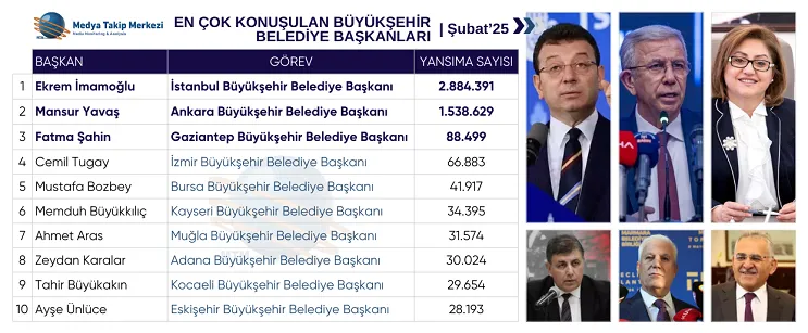• Memduh Büyükkılıç – Kayseri Büyükşehir Belediye Başkanı: 34 bin 395 kez konuşuldu. Kış turizmi ve Erciyes Kayak Merkezi projeleriyle öne çıktı. Turizm yatırımları ve kış sporlarına yönelik kampanyaları yerel basında geniş yer buldu.